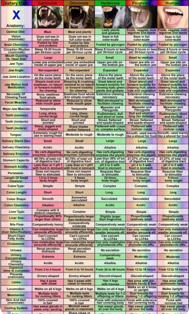 Jede Spezies auf diesem Planeten hat eine für sie spezifische Ernährung. Löwen sind Carnivore (Fleischfresser), Kühe sind Herbivore (Pflanzenfresser) und Primaten sind Frugivore (Früchtefresser). Wie vorher gelernt haben sie sich perfekt dahin entwickelt oder wurden perfekt dafür designed diese Nahrungsmittel zu verdauen. Ihre ganze Anatomie, ihre Instinkte sind darauf abgestimmt. Können Löwen auch Gras oder einen Apfel essen ohne gleich zu sterben? Ja. Werden sie immer ein frisch erlegtes Zebra bevorzugen? Ja. Sie werden angezogen von rohem Fleisch, haben Klauen, Reißzähne, extrem starke Magensäure und einen kurzen, glatten Darm um Fleischreste schnell auszuscheiden, damit diese nicht im Verdauungstrakt verwesen. Sie würden auf Dauer Probleme bekommen, wenn sie sich nur von Gras oder Äpfeln ernähren.